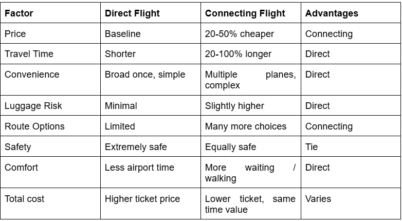 Choosing between a direct flight and a connecting flight is something which every traveller faces when booking airfare. Should you pay $200-500 extra for the convenience of a nonstop flight that saves 4-8 hours? Or should you choose the budget-friendly connecting flight and accept longer travel time, airport navigation, and potential delays?