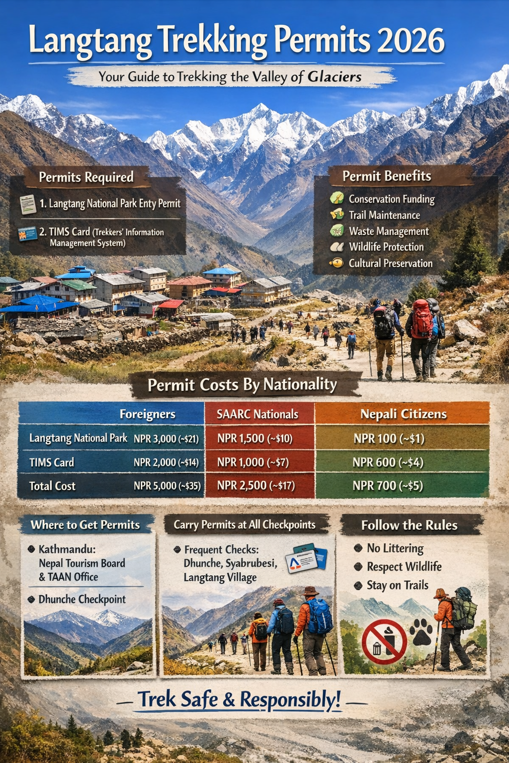 - Langtang National Park Entry Permit: NPR 1,500 or $10