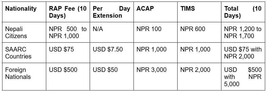If you are a foreign national, you must budget USD $500 plus ACAP and TIMS fees for the standard 10-day permit. SAARC country citizens enjoy significantly reduced rates at USD $75.
